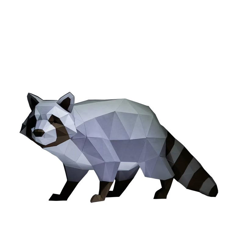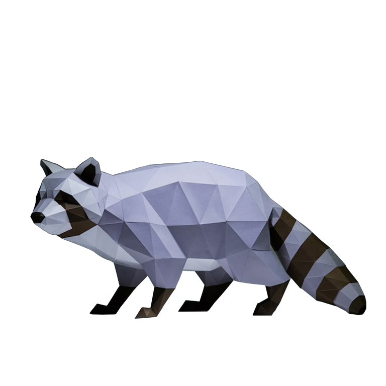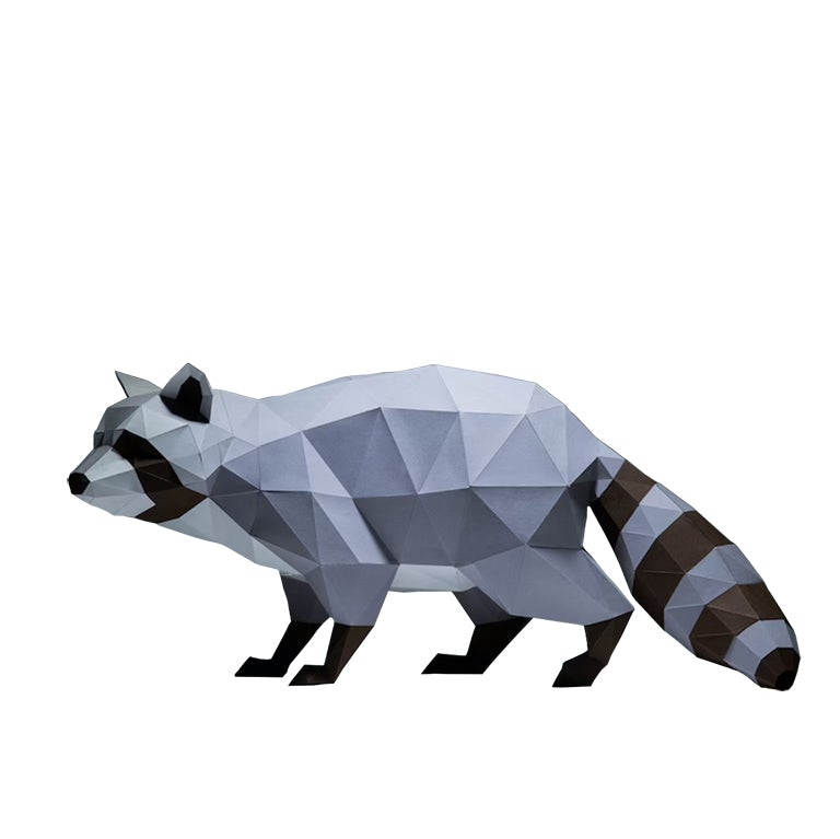 Made out of sturdy craft paper in grayscale tones, this 3D raccoon papercraft decoration mysteriously looms on all fours crouched in a sneaky midnight prowl position.